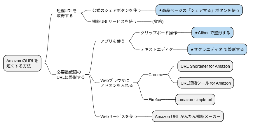 短縮URLを取得するには公式のシェアボタンを使う・短縮URLサービスを使う方法があり、必要最低限のURLに整形するにはアプリを使う・アドオンを入れる・Webサービスを使う方法があります。それぞれ枝分かれした末尾は具体的に短いURLにする方法です。