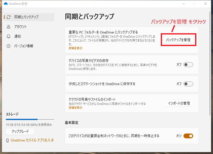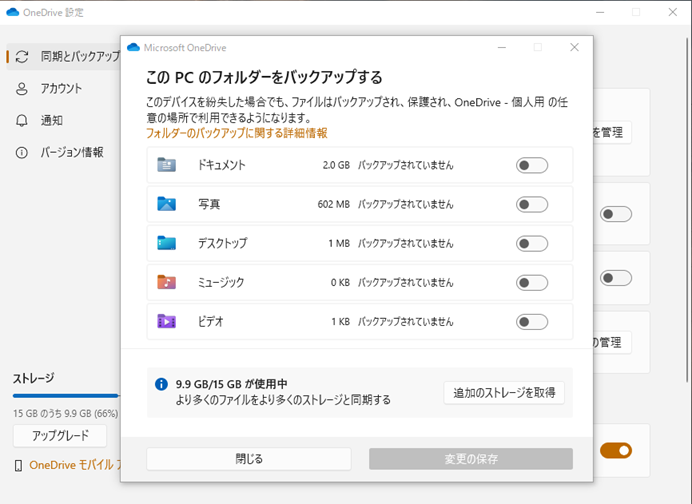 - OneDrive でバックアップの設定をする。