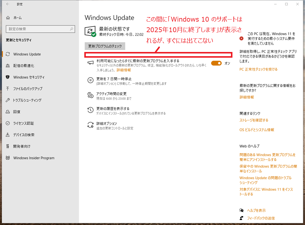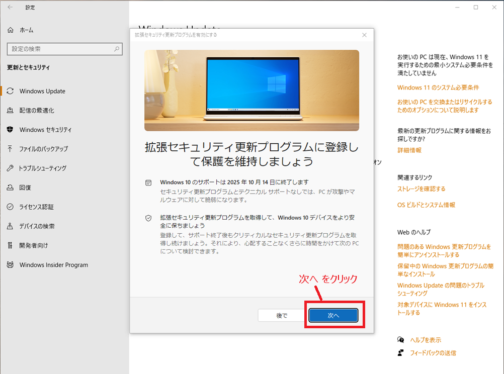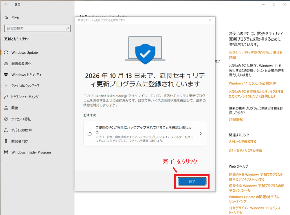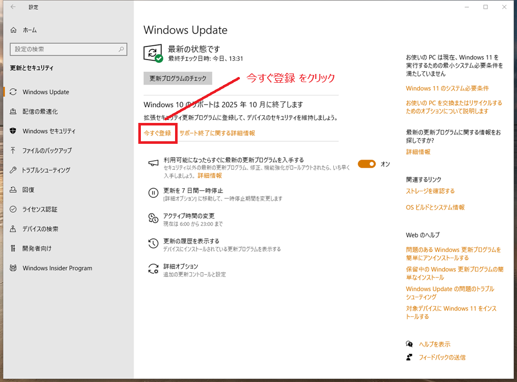 私のPCでは、この設定をしていなかったため後で記述している 拡張セキュリティ更新プログラム (ESU) の案内が表示されていませんでした。この設定をしていれば 7月末には出ていたようです。私のPCも この設定をした後に表示されるようになりました。
