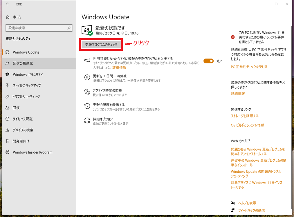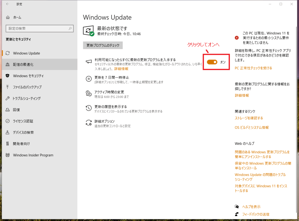 - 『利用可能になったらすぐに最新の更新プログラムを入手する』をオンにする。
