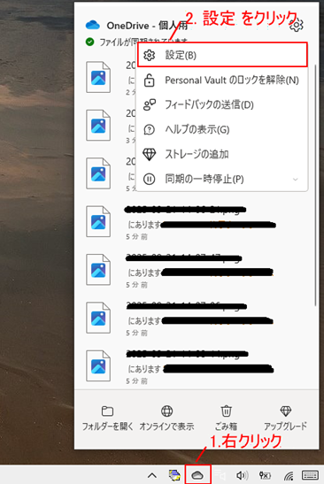 通知領域にある OneDrive のアイコンを右クリックし、表示されたポップアップメニューの『設定(B)』をクリックします。