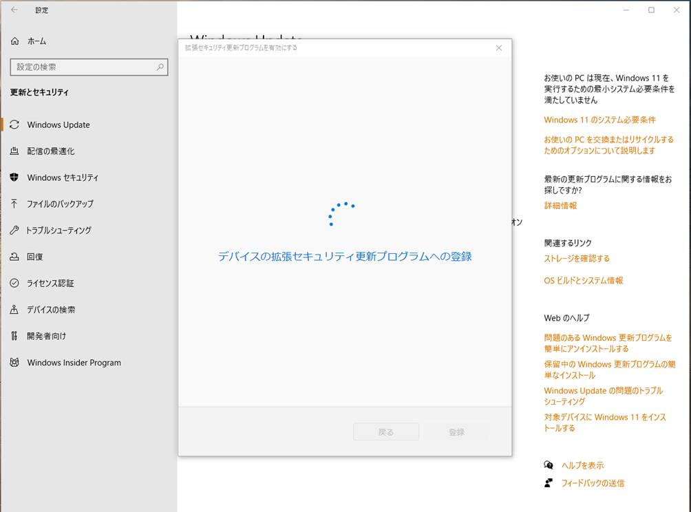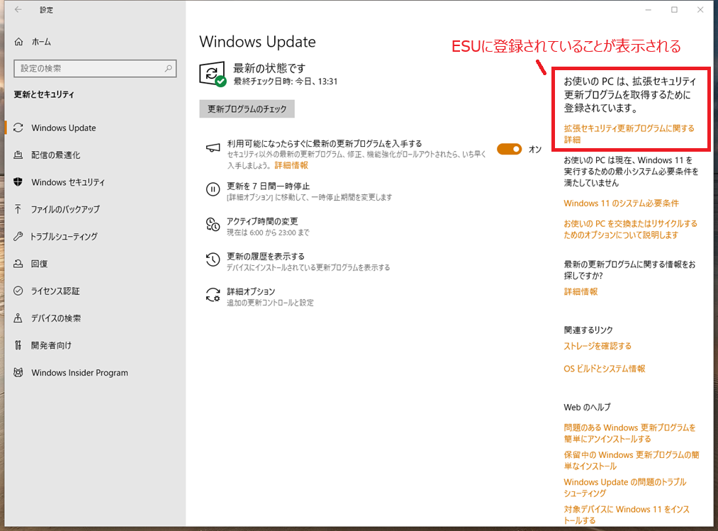 『拡張セキュリティ更新プログラム (ESU)』へ登録した私のPCの状態です。