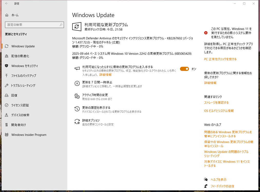 『利用可能になったらすぐに最新の更新プログラムを入手する』 を 『オン』にしたので、Windows Update を実行して最新にします。最新にすると、拡張セキュリティ更新プログラム (ESU) の登録の案内が表示されるようになります。